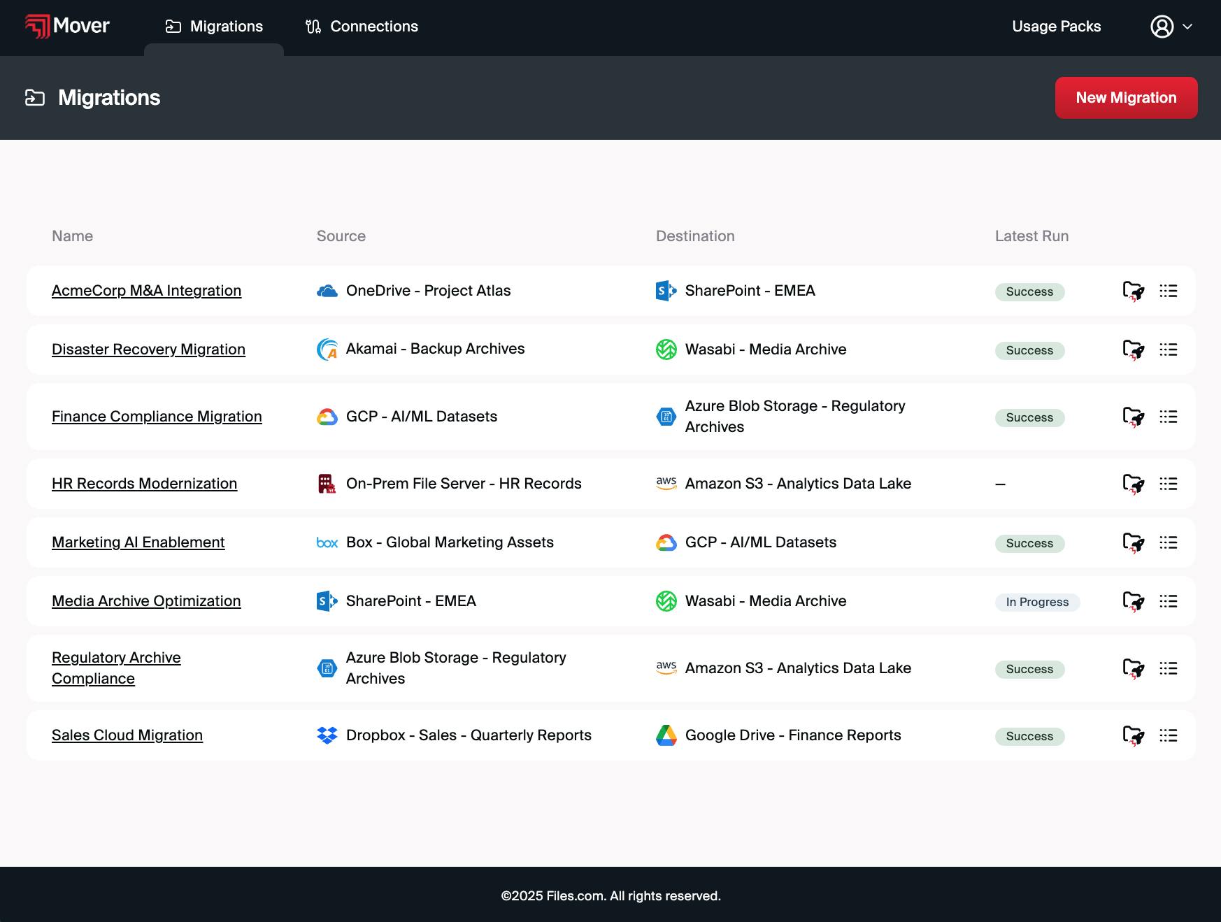 Mover is more than a migration tool - it’s the first step in a broader file operations journey. Enterprises trust it for scalable, secure migrations with transparent pricing and minimal IT overhead. Some migrate once and move on, while others naturally grow into Files.com for recurring syncs, automation, and enterprise-grade collaboration. Either way, Mover delivers immediate value and a trusted path forward.