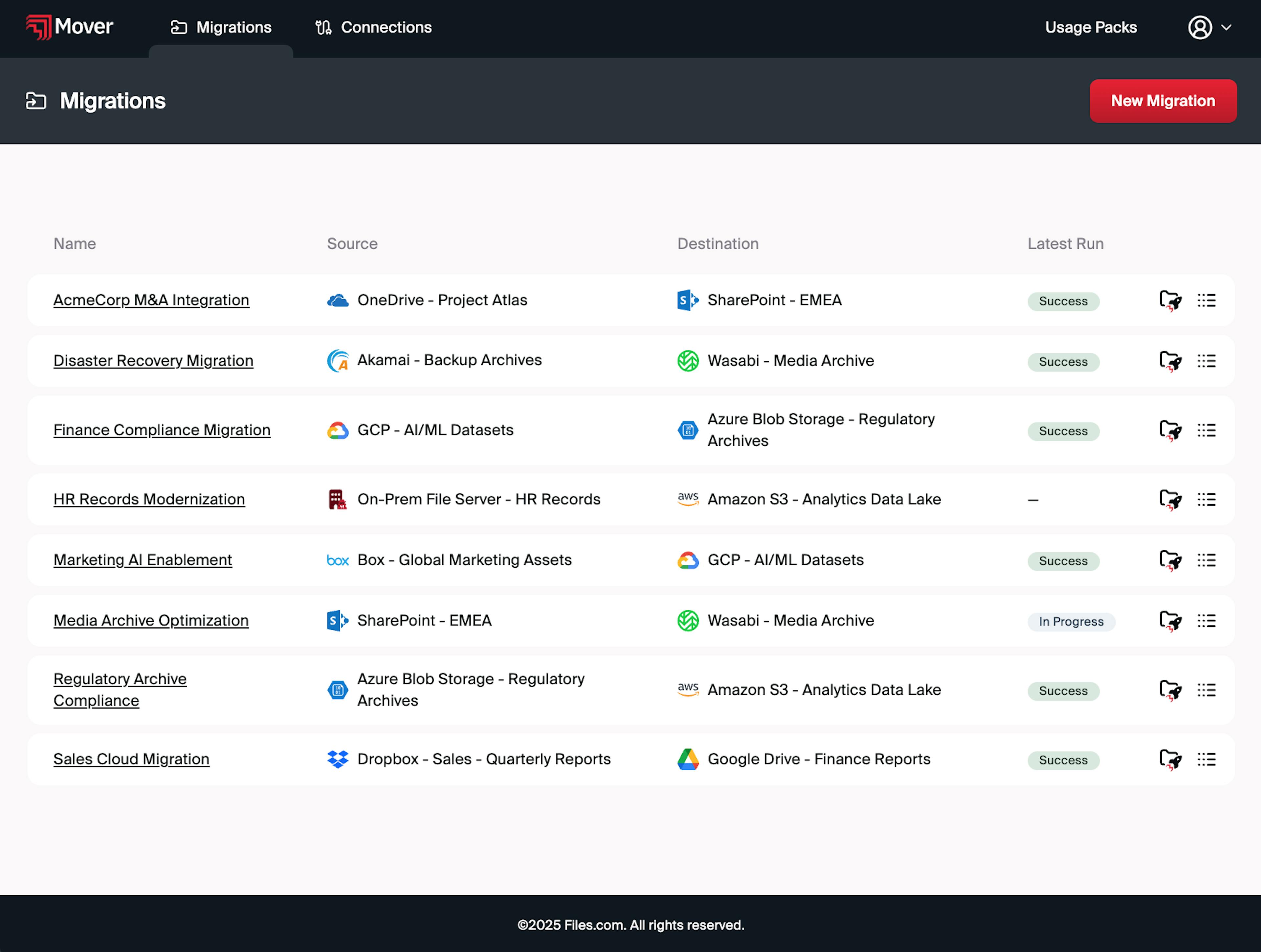 Mover is more than a migration tool - it’s the first step in a broader file operations journey. Enterprises trust it for scalable, secure migrations with transparent pricing and minimal IT overhead. Some migrate once and move on, while others naturally grow into Files.com for recurring syncs, automation, and enterprise-grade collaboration. Either way, Mover delivers immediate value and a trusted path forward.